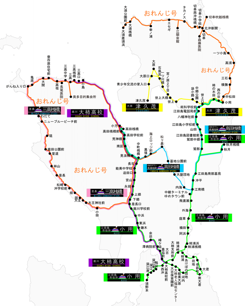 市内5路線を江田島市にちなんだラインカラーで区分しています。外国人観光客の誘客に向けた取り組みや小児の利用に配慮して、英語表記のほか、前面にはひらがなで行先を表示します。 定期航路 路線バス 緑色 小用~大柿線 オリーブの木をイメージ 水色 長瀬海岸線 江田島湾や長瀬海岸の穏やかな海をイメージ 黄色 津久茂線 市の花「キク」,オリーブオイルをイメージ 紫色 大柿~中町~高田線 江田島のサツマイモをイメージ ピンク色 是長線 市の木「サクラ」、沖美のスイートピーをイメージ